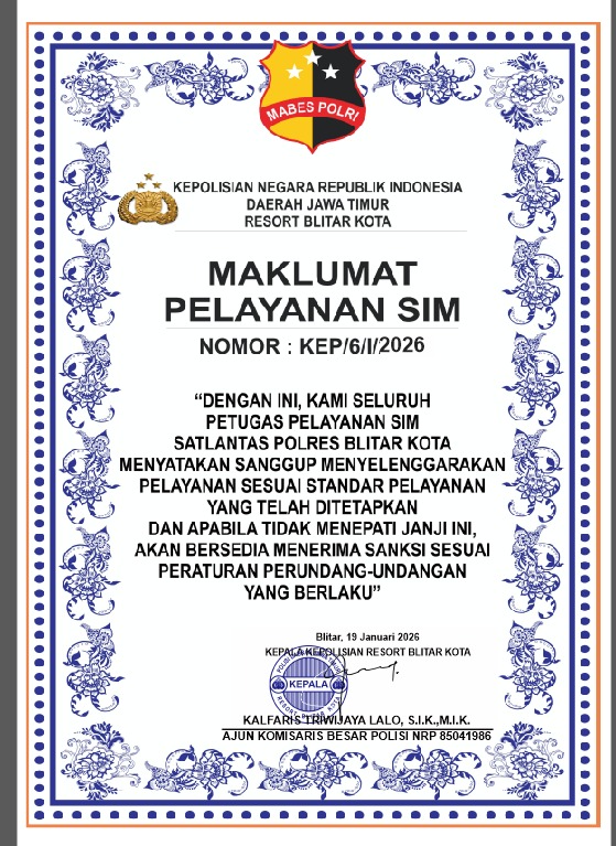 Kapolres Blitar Kota AKBP Kalfaris Triwijaya Lalo, S.I.K., M.I.K. melalui Kasat Lantas Polres Blitar Kota AKP Agus Prayitno menjelaskan bahwa standar pelayanan yang telah diterapkan di Satpas Polres Blitar Kota telah sesuai dengan ketentuan perundang undangan yang berlaku, Kamis 19/2/2026.