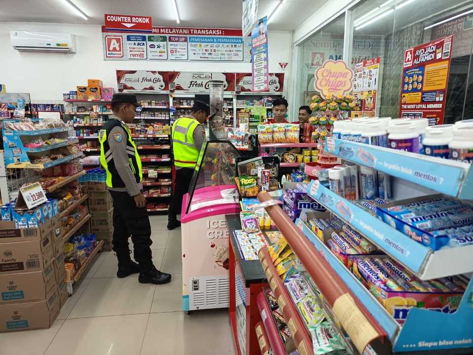 Personil melakukan patroli di minimarket dan bertemu karyawan toko setempat sembari menyampaikan himbauan tentang kewaspadaan terhadap gangguan Kamtibmas.