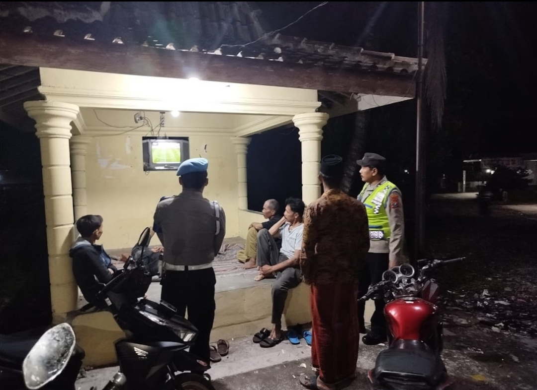 Anggota Polsek Nglegok yang melaksanakan patroli dan bertemu dengan warga yang melaksanakan siskamling di salah satu Poskamling di lingkungan Desa Ngoran.