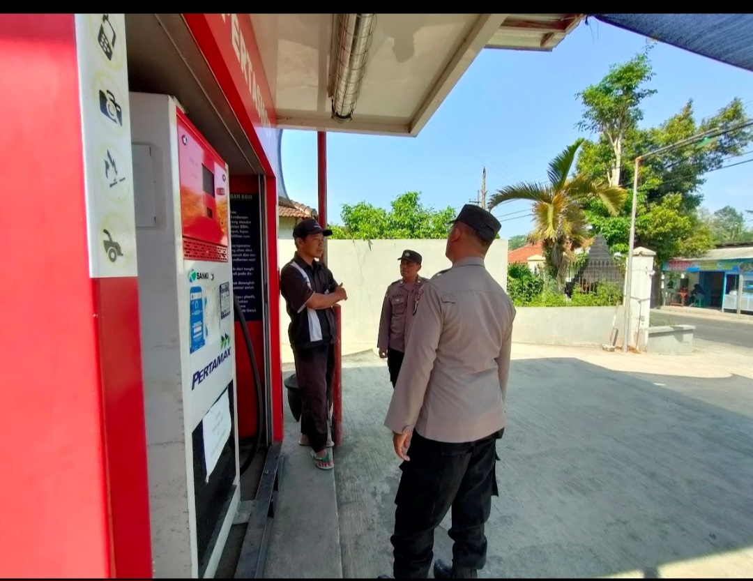 Anggota Polsek Nglegok melaksanakan patroli dialogis dengan karyawan pertashop di Desa Penataran dan warga yang mengisi BBM (07 Desember 2025).