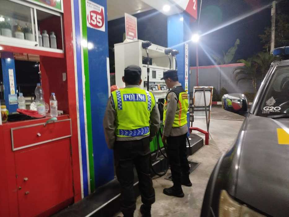 Patroli di SPBU dilakukan Anggota Polsek Srengat dan Dialogis dengan Pengendara Sepeda Motor