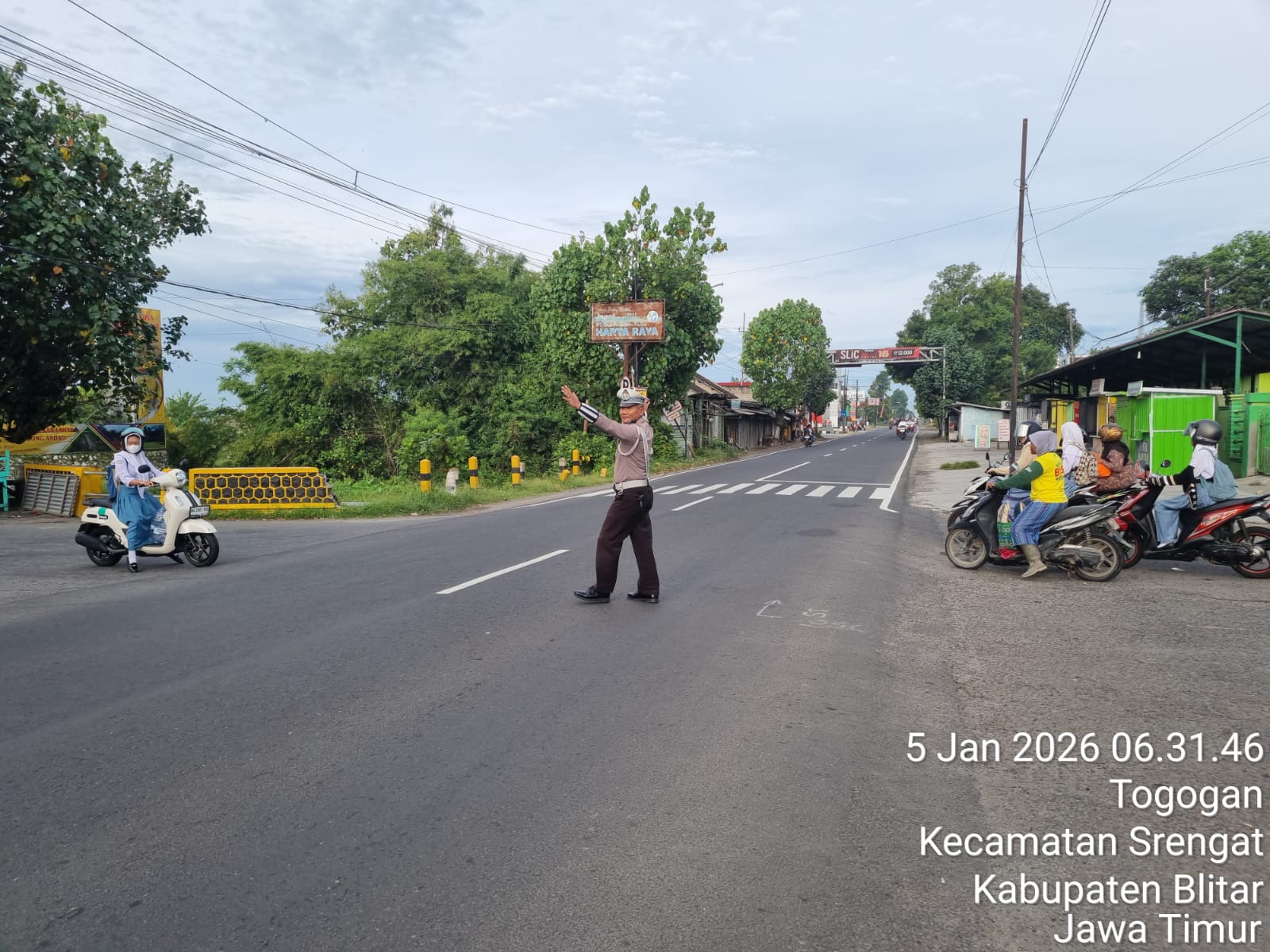 Polres Blitar Kota – Setiap pagi hari anggota Polsek Srengat Polres Blitar Kota selalu hadir di tengah – tengah masyarakat yang membutuhkan pelayanan masyarakat terutama pengguna jalan.Anggota Polsek Srengat melaksanakan kegiatan pengaturan arus lalu lintas baik di depan sekolah maupun di simpul – simpul jalan. Senin, 05/01/2026.
