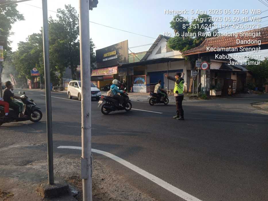 Polres Blitar Kota – Setiap pagi hari anggota Polsek Srengat Polres Blitar Kota selalu hadir di tengah – tengah masyarakat yang membutuhkan pelayanan masyarakat terutama pengguna jalan.Anggota Polsek Srengat melaksanakan kegiatan pengaturan arus lalu lintas baik di depan sekolah maupun di simpul – simpul jalan. Selasa, 05/08/2025.