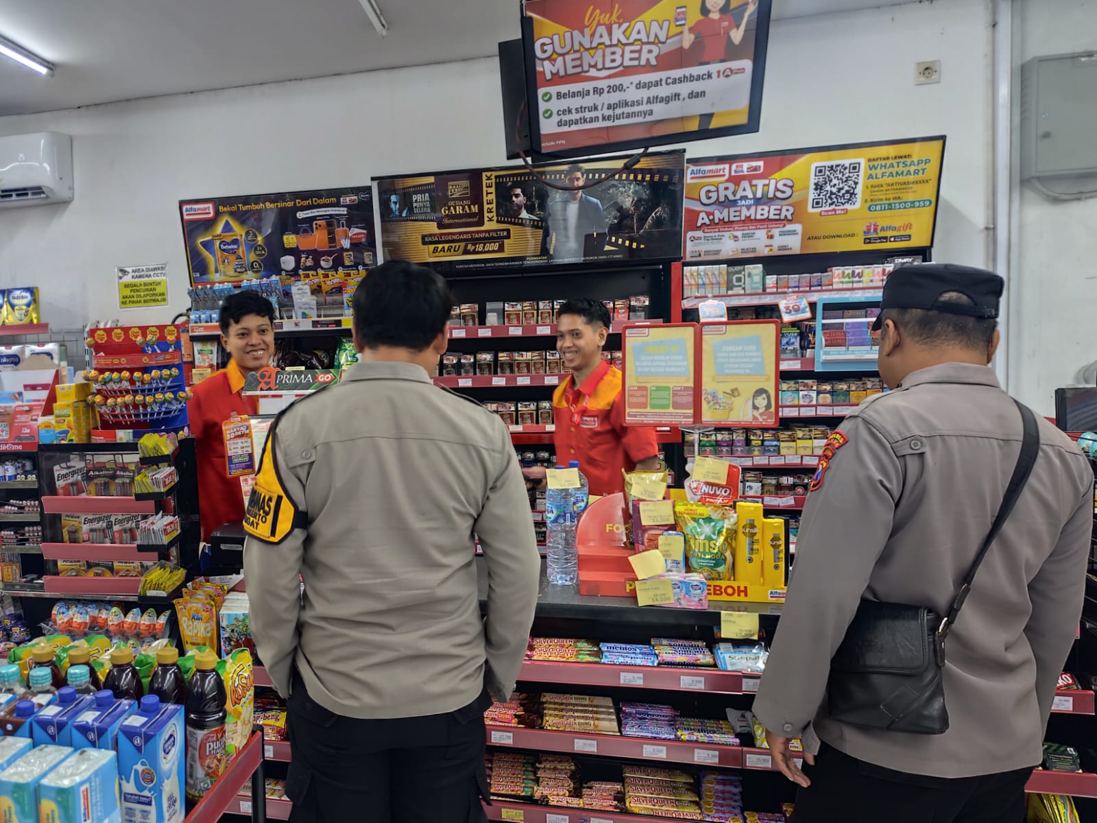 Personil melakukan patroli di minimarket dan bertemu karyawan toko setempat sembari menyampaikan himbauan tentang kewaspadaan terhadap gangguan Kamtibmas.