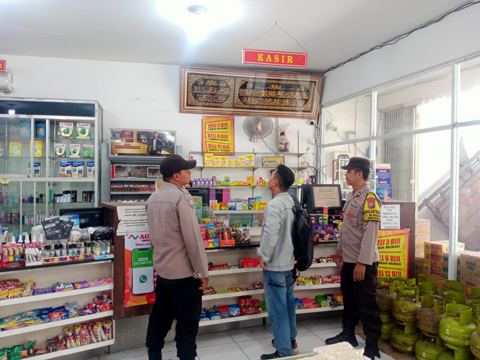 Personil melakukan patroli di minimarket dan bertemu karyawan toko setempat sembari menyampaikan himbauan tentang kewaspadaan terhadap gangguan Kamtibmas.