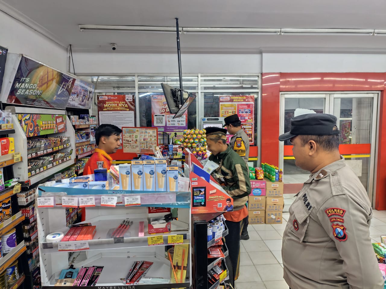 Personil melakukan patroli di minimarket dan bertemu karyawan toko setempat sembari menyampaikan himbauan tentang kewaspadaan terhadap gangguan Kamtibmas.
