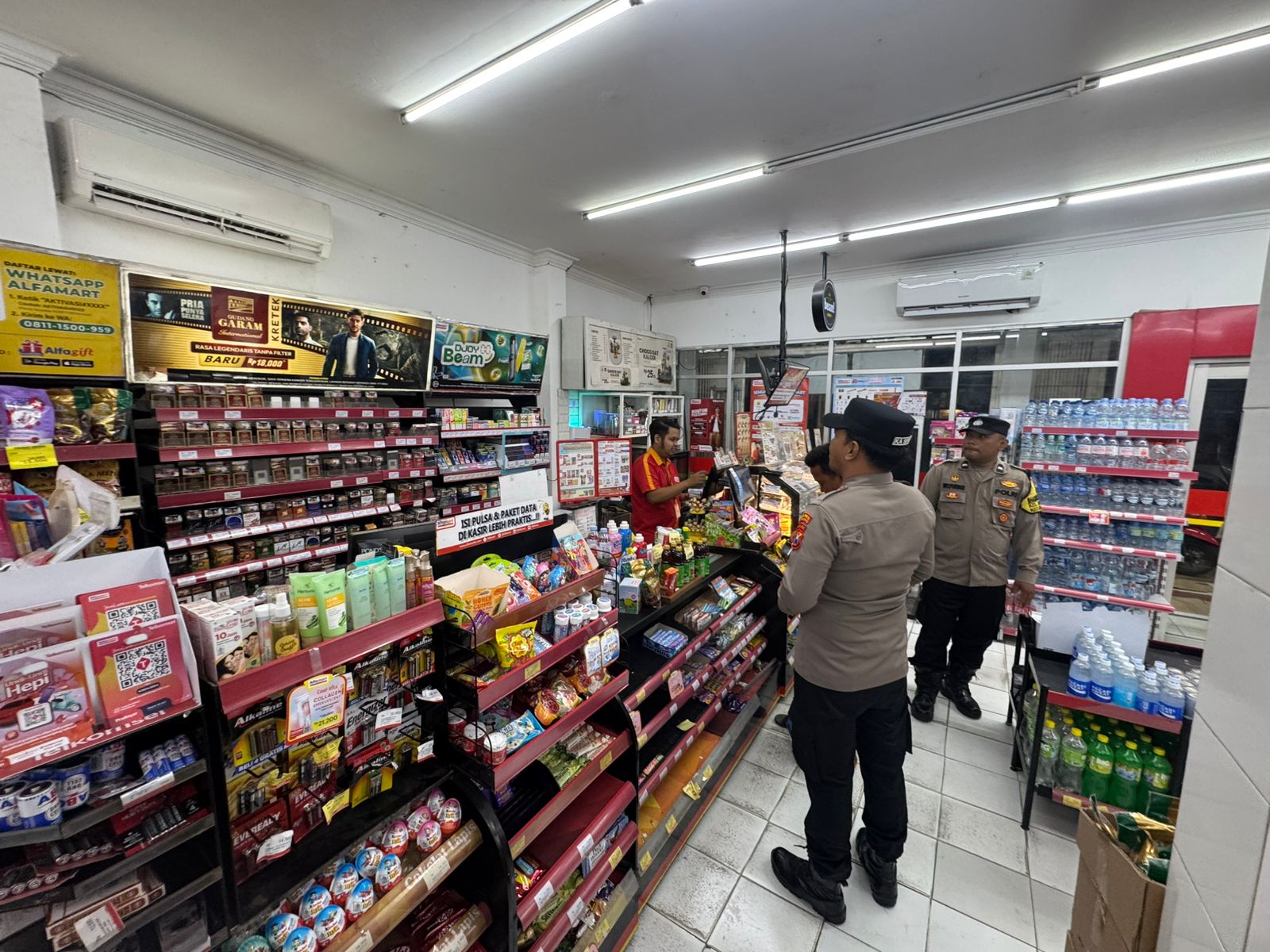 Personil melakukan patroli di minimarket dan bertemu karyawan toko setempat sembari menyampaikan himbauan tentang kewaspadaan terhadap gangguan Kamtibmas.