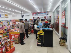 Personil melakukan patroli di minimarket dan bertemu karyawan toko setempat sembari menyampaikan himbauan tentang kewaspadaan terhadap gangguan Kamtibmas.