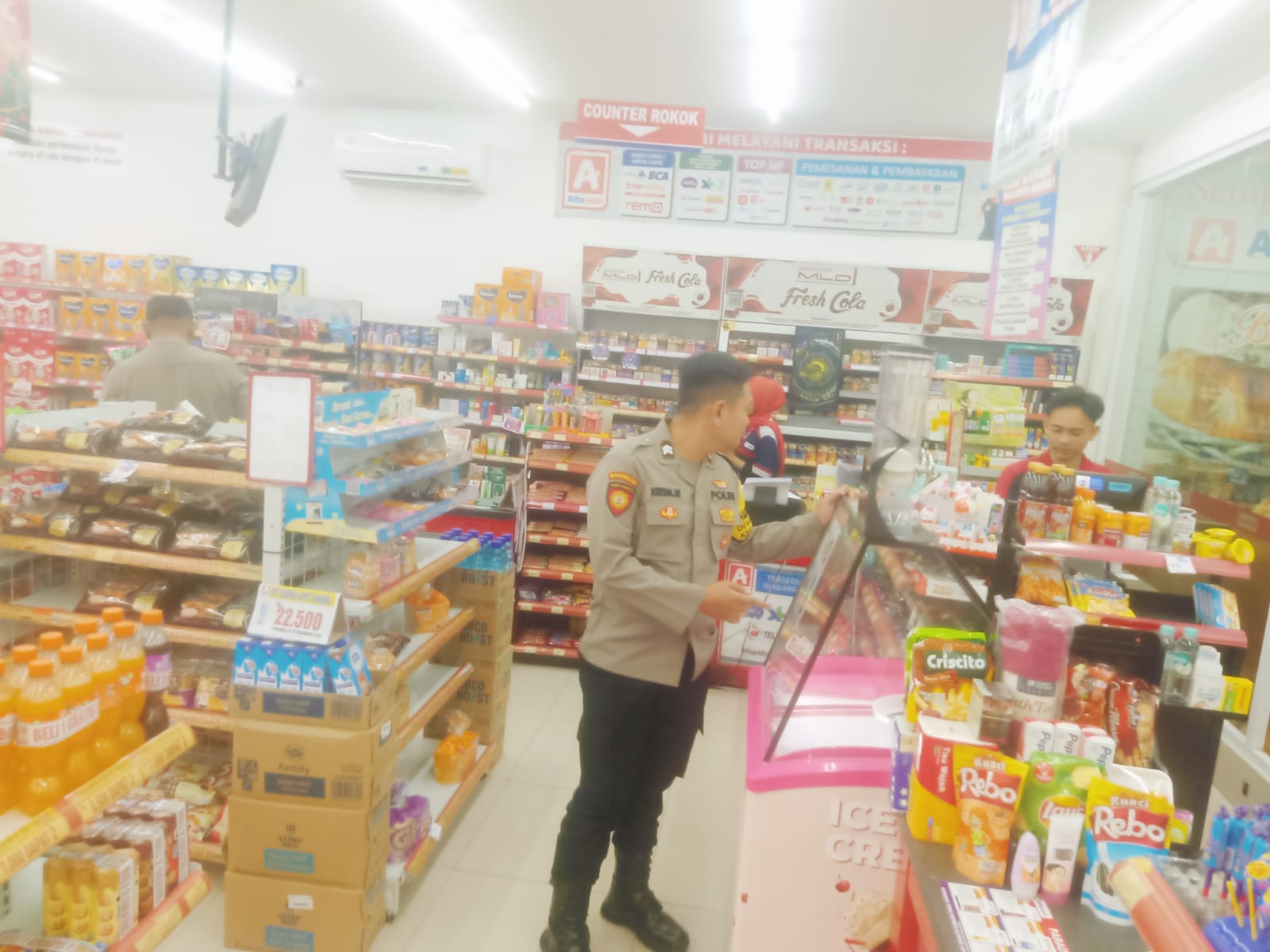 Personil melakukan patroli di minimarket dan bertemu karyawan toko setempat sembari menyampaikan himbauan tentang kewaspadaan terhadap gangguan Kamtibmas.