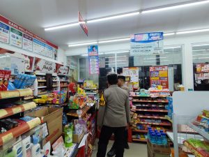 Personil melakukan patroli di minimarket dan bertemu karyawan toko setempat sembari menyampaikan himbauan tentang kewaspadaan terhadap gangguan Kamtibmas.