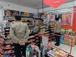 Personil melakukan patroli di minimarket dan bertemu karyawan toko setempat sembari menyampaikan himbauan tentang kewaspadaan terhadap gangguan Kamtibmas.