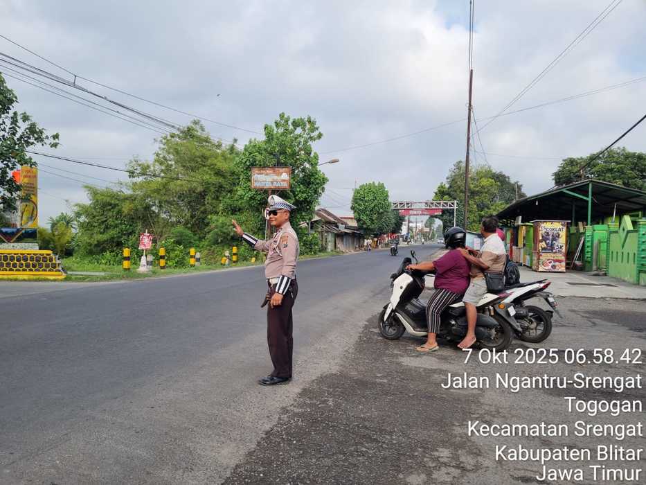 Polres Blitar Kota – Setiap pagi hari anggota Polsek Srengat Polres Blitar Kota selalu hadir di tengah – tengah masyarakat yang membutuhkan pelayanan masyarakat terutama pengguna jalan.Anggota Polsek Srengat melaksanakan kegiatan pengaturan arus lalu lintas baik di depan sekolah maupun di simpul – simpul jalan. Selasa, 07/10/2025.