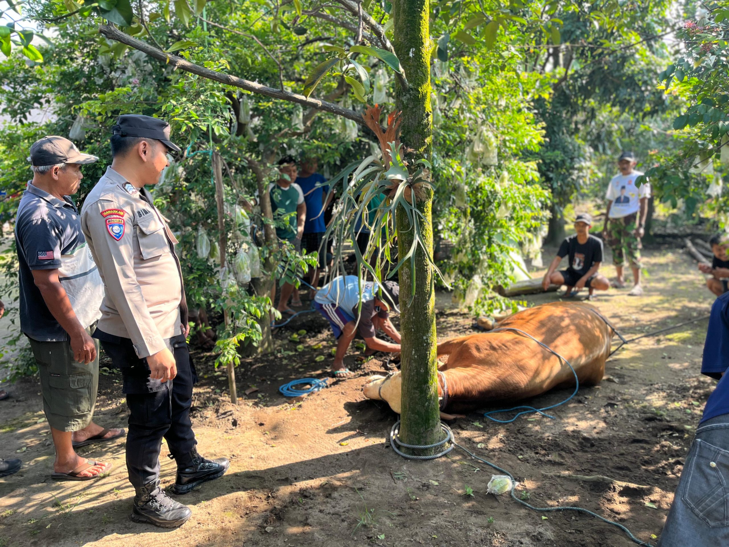 Semangat Hari Raya Idul Adha 1446 H, Polres Blitar Kota terutama Polsek Ponggok, Bhabinkamtibmas Desa Jatilengger Kecamatan Ponggok, Kabupaten Blitar turut hadir dalam kegiatan penyembelihan hewan kurban yang dilaksanakan oleh warga setempat, Jumat (6/6/2025). Kehadiran mereka sebagai bentuk dukungan serta penguatan sinergi antara aparat dan masyarakat.
