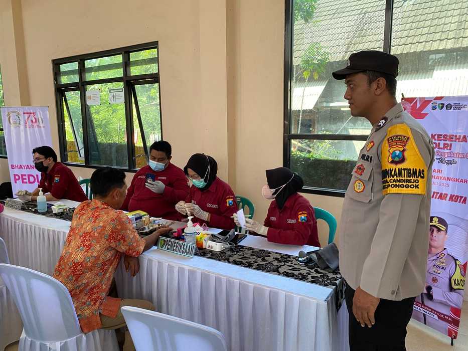 Peringatan Hari Bhayangkara ke-79 ini, Polres Blitar Kota menggelar pemeriksaan dan pengobatan gratis bagi masyarakat, Senin (23/6/2025), bertempat di Gedung Serbaguna Desa Candirejo Kecamatan Ponggok Kabupaten Blitar.