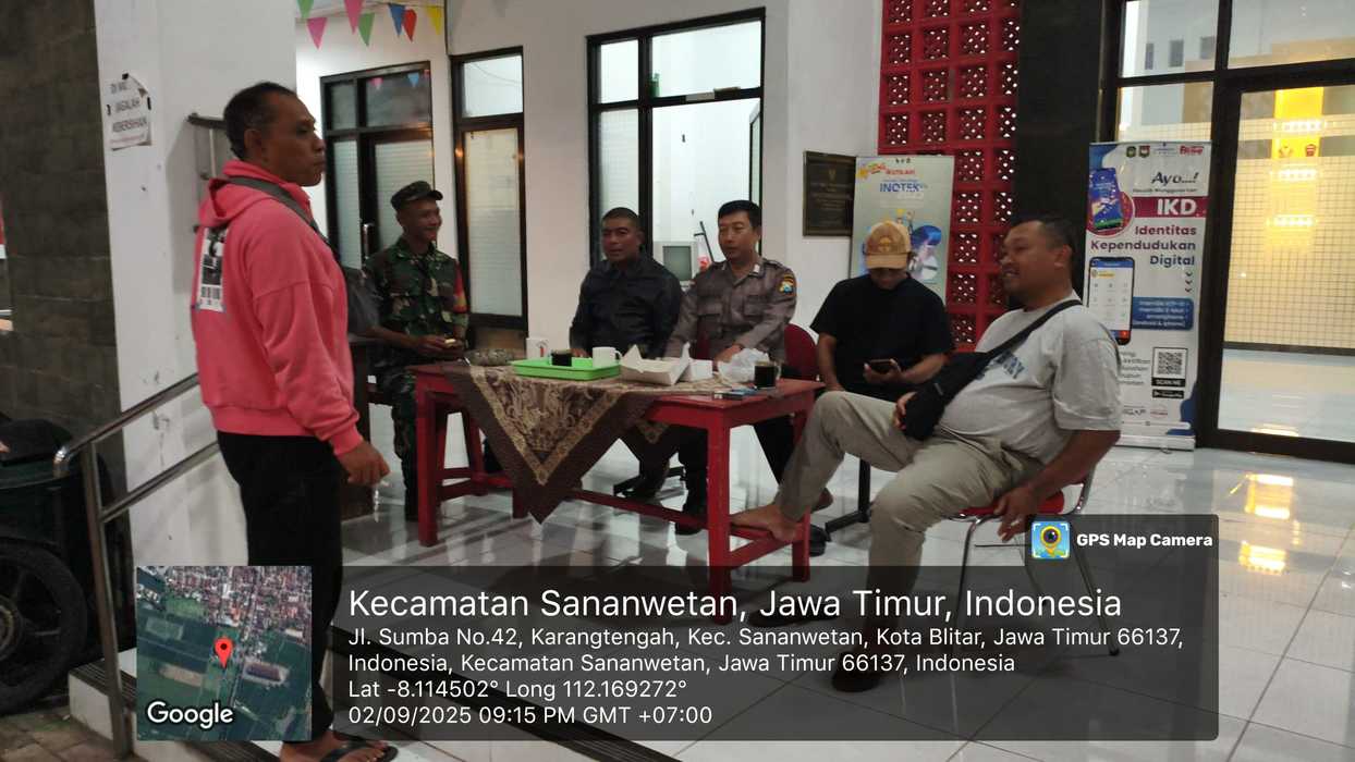 Blitar – Upaya menjaga keamanan dan ketertiban masyarakat terus dilakukan aparat kepolisian bersama warga pasca terjadinya penyerangan kantor pemerintah di wilayah lain. Sebagai bentuk antisipasi, Bhabinkamtibmas Kelurahan Karangtengah, Bripka Heru Sancoko, menginisiasi kegiatan siaga malam di Kantor Kelurahan Karangtengah yang berlokasi di Jalan Sumba, Kelurahan Karangtengah, Kecamatan Sananwetan, Kota Blitar.