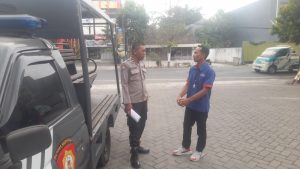 Polsek Sukorejo – Bhabinkamtibmas Kelurahan Tlumpu, Aipda Dian Harianto, melakukan sambang dialogis dengan petugas parkir di pertokoan Jalan cemara. Senin, 5 Mei 2025.