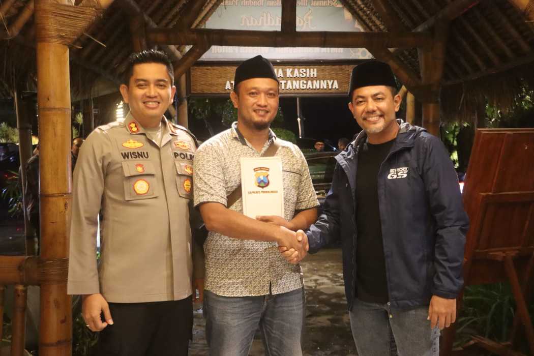 PROBOLINGGO,- Bupati Probolinggo dr. Mohammad Haris atau Gus Haris bersama Kapolres Probolinggo AKBP Wisnu Wardana memberikan apresiasi kepada Aipda Andik Muhyeni, Polisi yang berhasil melumpuhkan dua begal di perempatan pabrik Sasa Gending, pada Sabtu (22/3/2025).