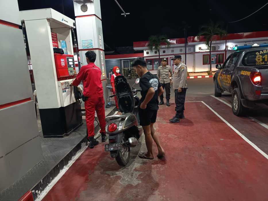 Anggota Polsek Nglegok berpatroli di obyek vital SPBU yang ramai pembeli