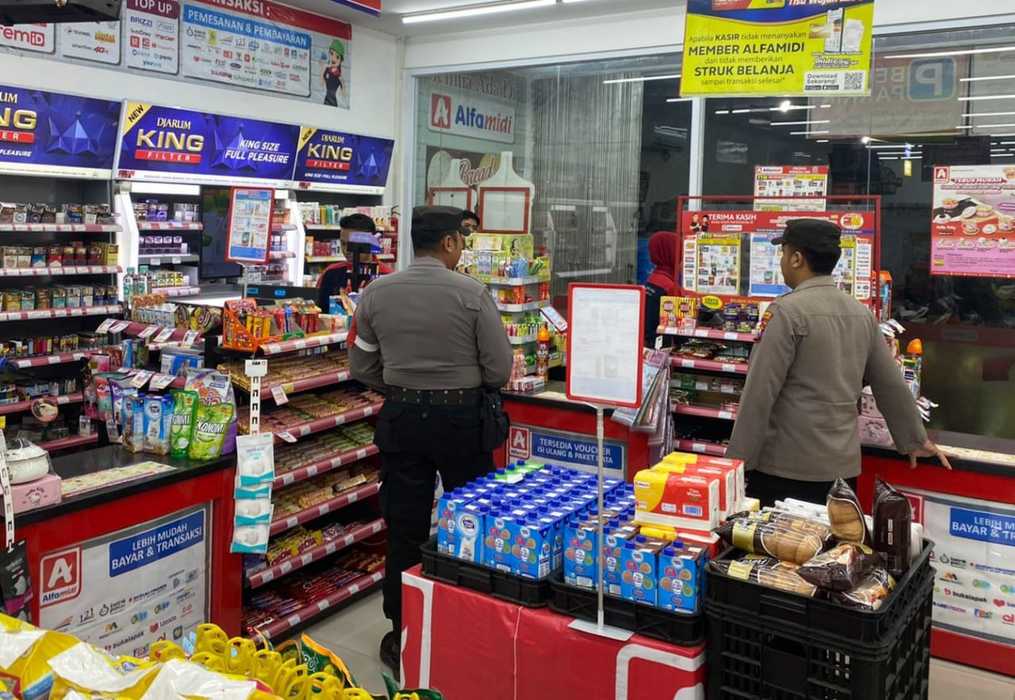Personil melakukan patroli di Minimarket Srengat dan bertemu karyawan toko setempat sembari menyampaikan himbauan tentang kewaspadaan terhadap gangguan Kamtibmas.