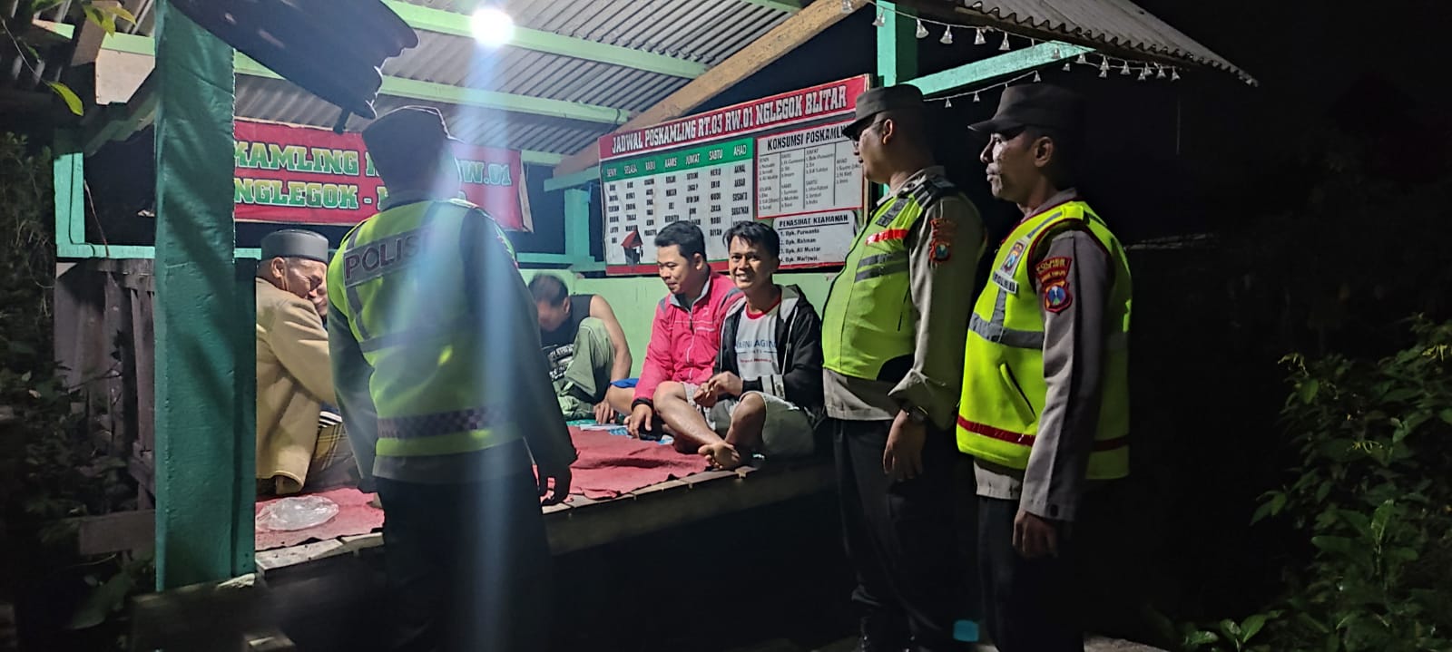 Anggota Polsek Nglegok yang melaksanakan patroli mobiling, berhenti di salah satu poskamling warga di lingkungan Desa Jiwut. Beberapa warga terlihat sedang berada di poskamling dan sebagian melaksanakan ronda keliling lingkungan.