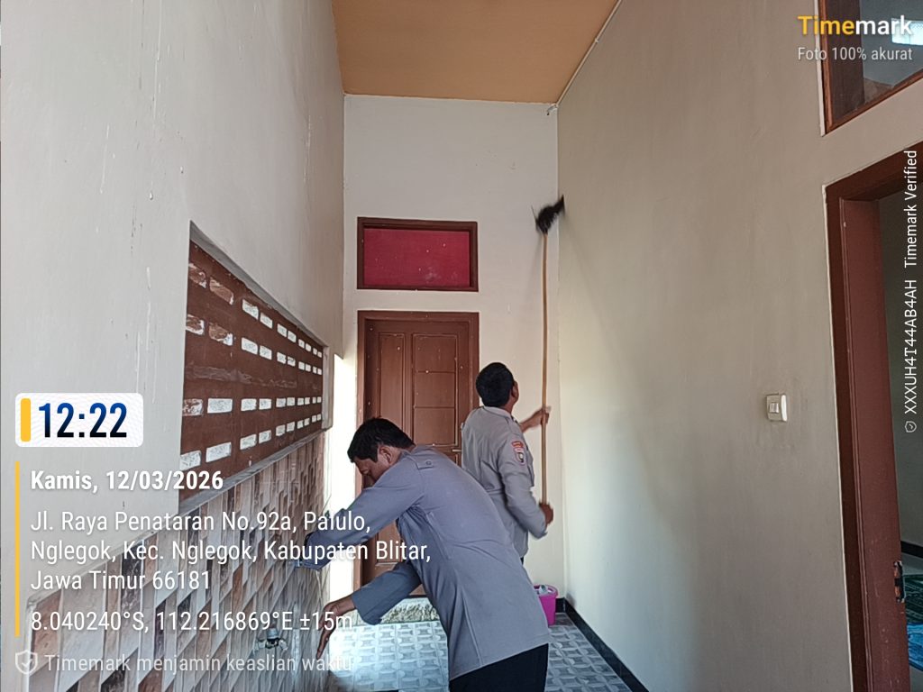 BLITAR – Personel Bhabinkamtibmas Polsek Nglegok menunjukkan komitmennya dalam menjaga kebersihan lingkungan sekaligus mempererat tali silaturahmi dengan warga. Hal ini diwujudkan melalui kegiatan “Kurve” atau kerja bakti membersihkan Masjid Darussalam yang berlokasi di Kelurahan Nglegok, Kamis (12/03/2026).