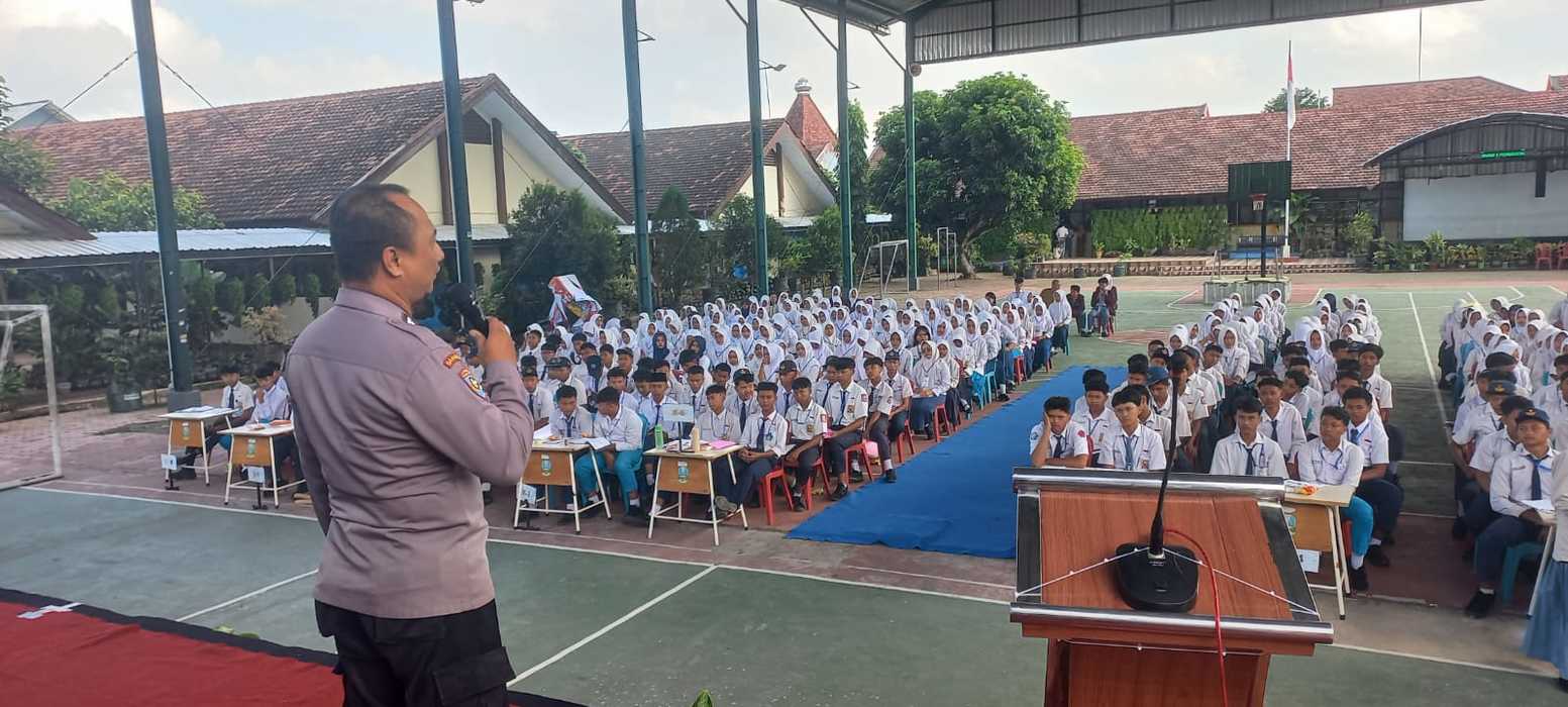 Bertempat di SMPN 1 Ponggok Kanit Binmas Aiptu Aris menjadi Narasumber dalam kegiatan MPLS dengan materi meliputi Pencegahan Penyalahgunaan Narkoba, dan kenakalan remaja, Senin (14/07/2025).