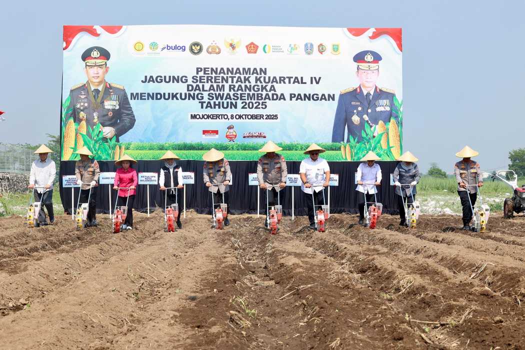 Kapolda Jawa Timur,Irjen Pol Drs.Nanang Avianto,M.Si memimpin langsung kegiatan penanaman Jagung serentak Kuartal IV tahun 2025 di Desa Pacing, Kecamatan Bangsal, Kabupaten Mojokerto, Rabu (8/10/2025).