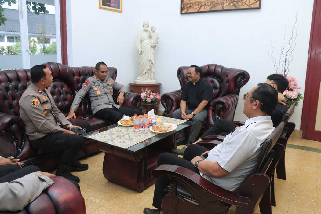 KOTA BLITAR – Kapolres Blitar Kota, AKBP Titus Yudho Uly, S.I.K., M.Si., bersama para Pejabat Utama (PJU) Polres Blitar Kota, melaksanakan kegiatan “Minggu Kasih” sebagai bentuk silaturahmi dengan tokoh agama. Kegiatan tersebut dilaksanakan dengan mengunjungi Pendeta Gereja Santo Yusup yang terletak di Kelurahan Bendogerit, Kecamatan Sananwetan, Kota Blitar. Dalam pertemuan tersebut, Kapolres Blitar Kota disambut hangat oleh Pendeta Gereja Santo Yusup beserta jemaat.