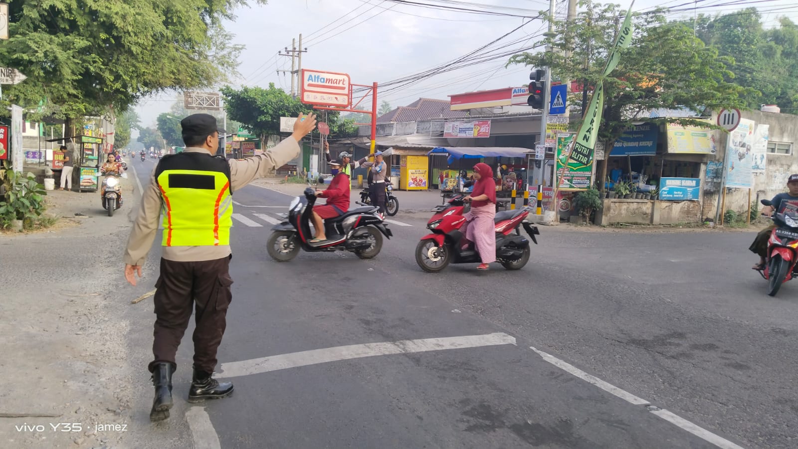 Petugas tampak melaksanakan pengaturan arus lalu lintas, membantu penyeberangan masyarakat dan pelajar, serta memberikan imbauan kepada pengendara agar selalu tertib dan mematuhi peraturan lalu lintas.