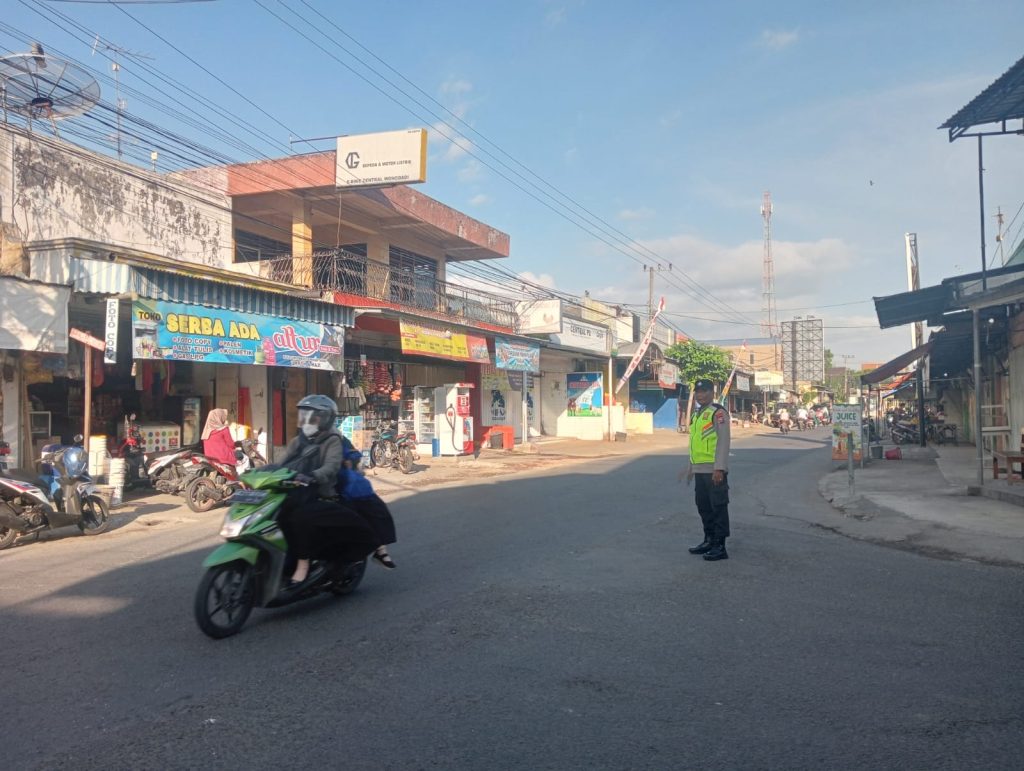 Petugas tampak melaksanakan pengaturan arus lalu lintas, membantu penyeberangan masyarakat dan pelajar, serta memberikan imbauan kepada pengendara agar selalu tertib dan mematuhi peraturan lalu lintas.