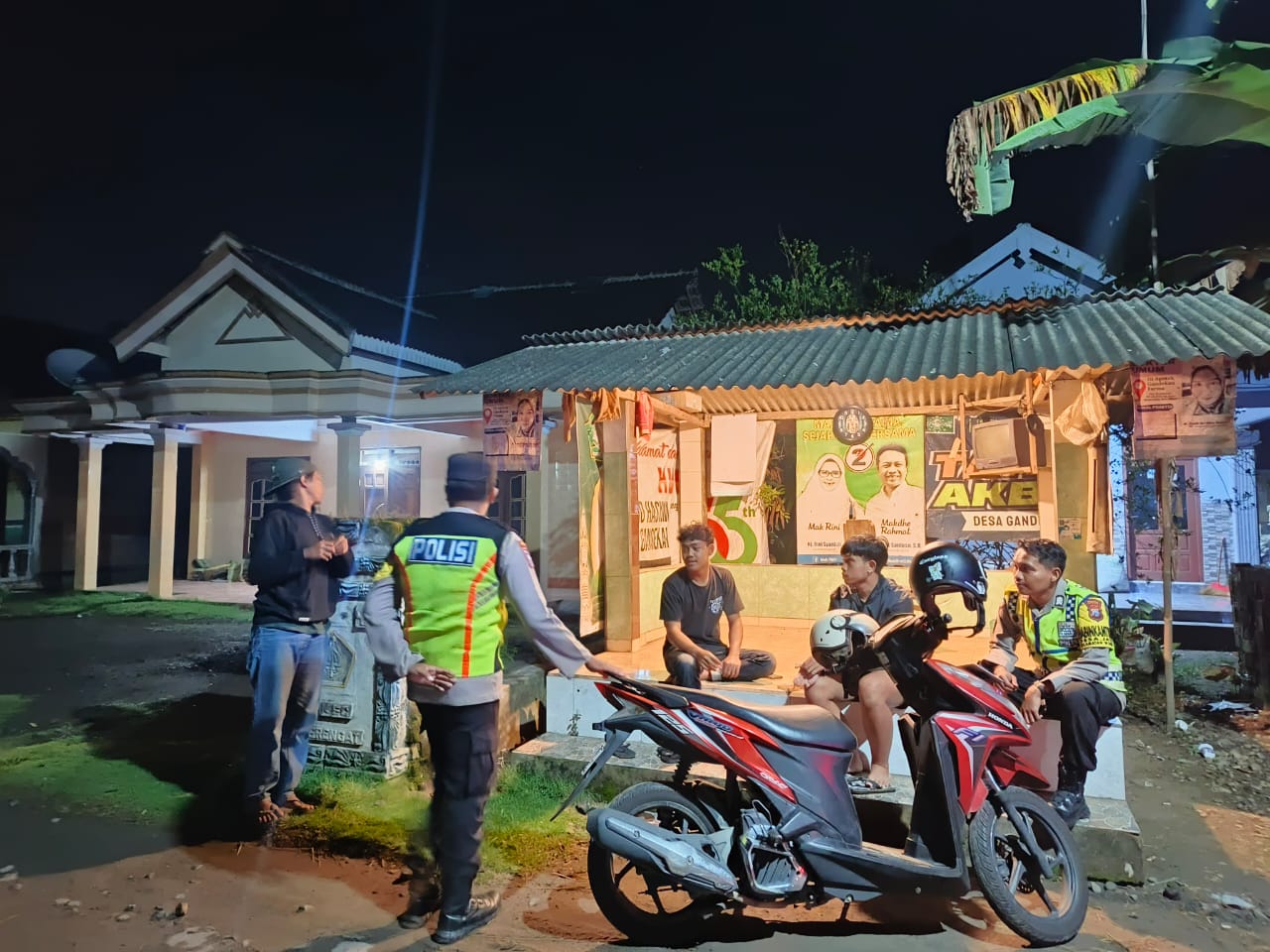 Kegiatan patroli dilaksanakan dengan menyambangi warga masyarakat yang masih beraktivitas pada malam hari di salah satu pos kamling desa. Dalam kesempatan tersebut, petugas berdialog langsung dengan para pemuda dan warga guna menyampaikan pesan-pesan kamtibmas serta mengajak masyarakat untuk turut berperan aktif menjaga keamanan lingkungan.