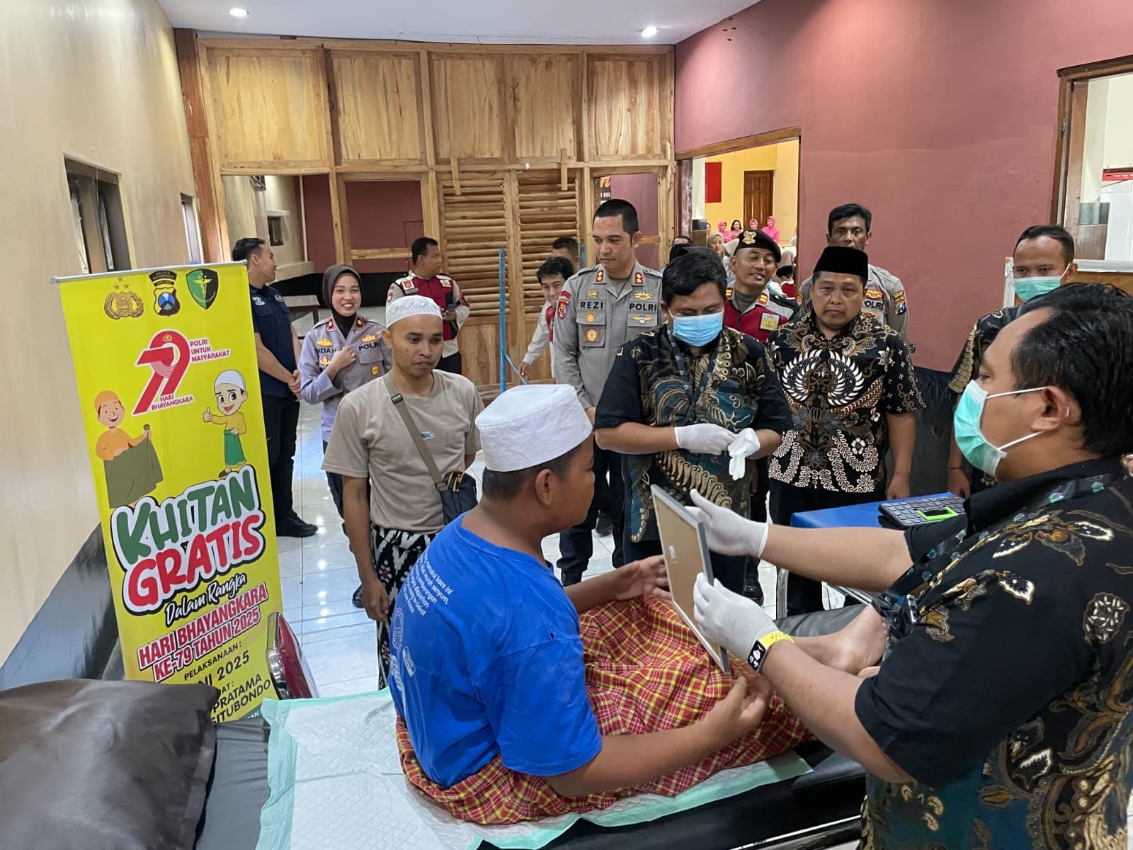 Khitan gratis bagi anak yatim dan piatu sebagai wujud syukur menyongsong Hari Bhayangkara ke-79 ini, lanjut Kapolres Rezi, dilaksanakan di Gedung Bhayangkara Polres Situbondo Polda Jatim.