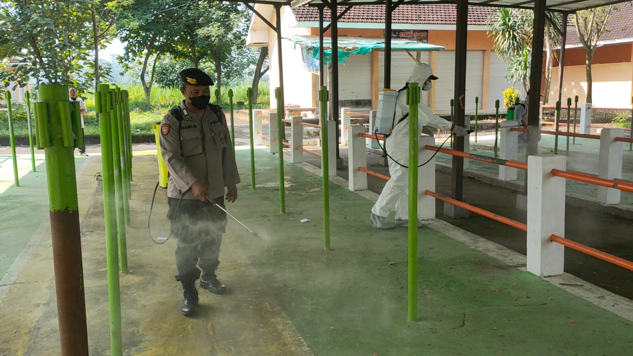 Polsek Srengat – Panit Binmas Polsek Srengat Iptu H. M. Ali Sukron,Sh. Bersama Personil Polsek Srengat dan petugas peternakan serta Koramil 06 Srengat laksanakan Penyemprotan Disinfektan guna antisipasi penyebaran adanya penyakit/Virus mulut dan kaki (PMK) yang menyerang Hewan Ternak di Pasar Hewan Srengat Kecamatan Srengat, Rabu (15/6/2022).