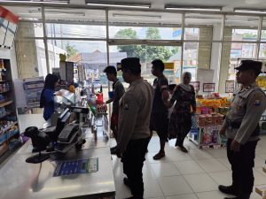 Personil melakukan patroli di minimarket dan bertemu karyawan toko setempat sembari menyampaikan himbauan tentang kewaspadaan terhadap gangguan Kamtibmas.
