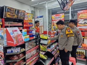 Personil melakukan patroli di minimarket dan bertemu karyawan toko setempat sembari menyampaikan himbauan tentang kewaspadaan terhadap gangguan Kamtibmas.