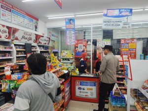 Personil melakukan patroli di minimarket dan bertemu karyawan toko setempat sembari menyampaikan himbauan tentang kewaspadaan terhadap gangguan Kamtibmas.