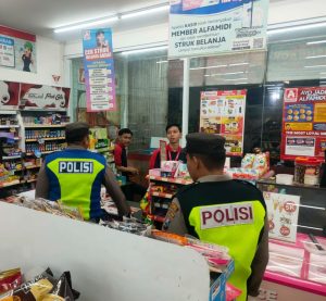 Personil melakukan patroli di minimarket dan bertemu karyawan toko setempat sembari menyampaikan himbauan tentang kewaspadaan terhadap gangguan Kamtibmas.