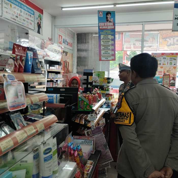 Personil melakukan patroli di minimarket dan bertemu karyawan toko setempat sembari menyampaikan himbauan tentang kewaspadaan terhadap gangguan Kamtibmas.
