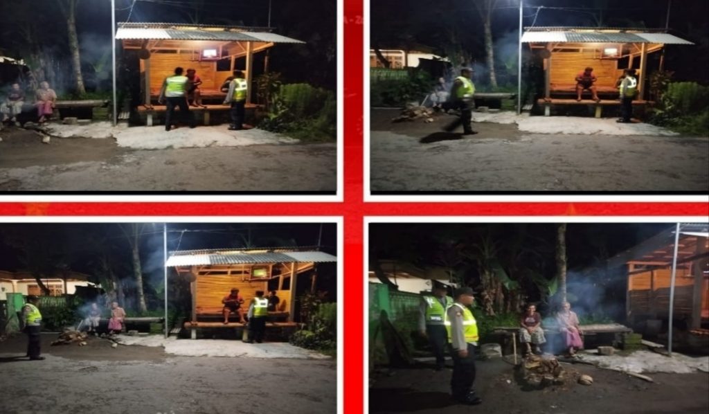 Anggota Polsek Nglegok yang melaksanakan patroli dan bertemu dengan warga yang melaksanakan siskamling di salah satu Poskamling di lingkungan Desa Kedawung.