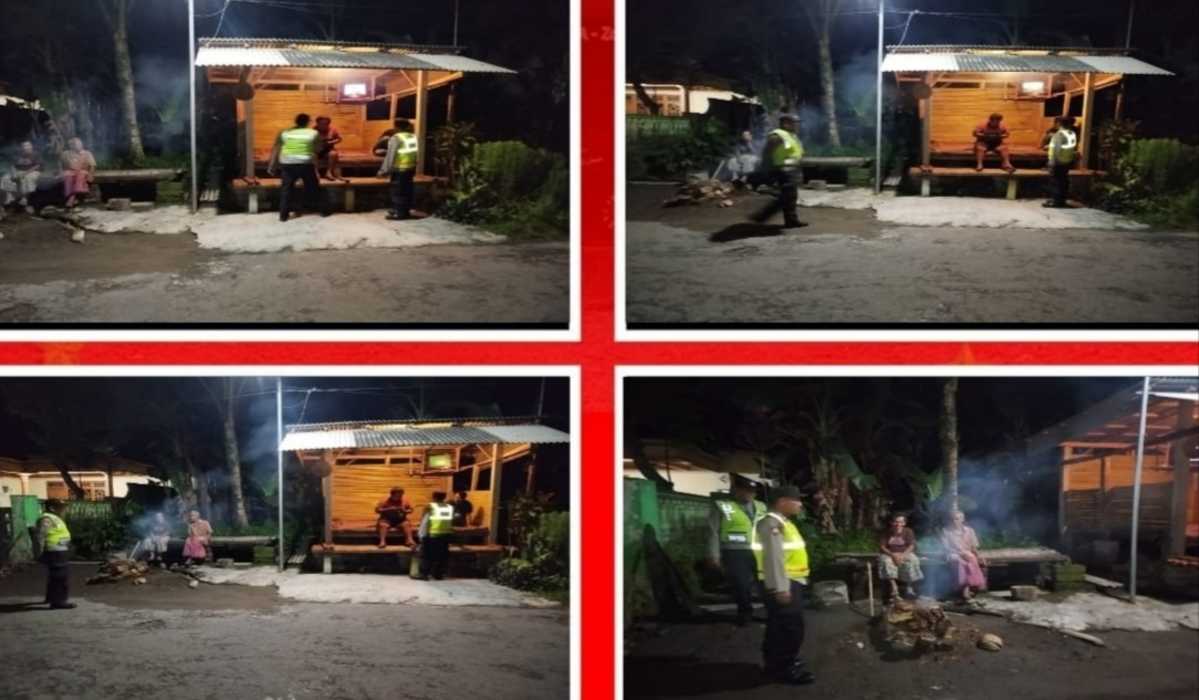 Anggota Polsek Nglegok yang melaksanakan patroli dan bertemu dengan warga yang melaksanakan siskamling di salah satu Poskamling di lingkungan Desa Kedawung.