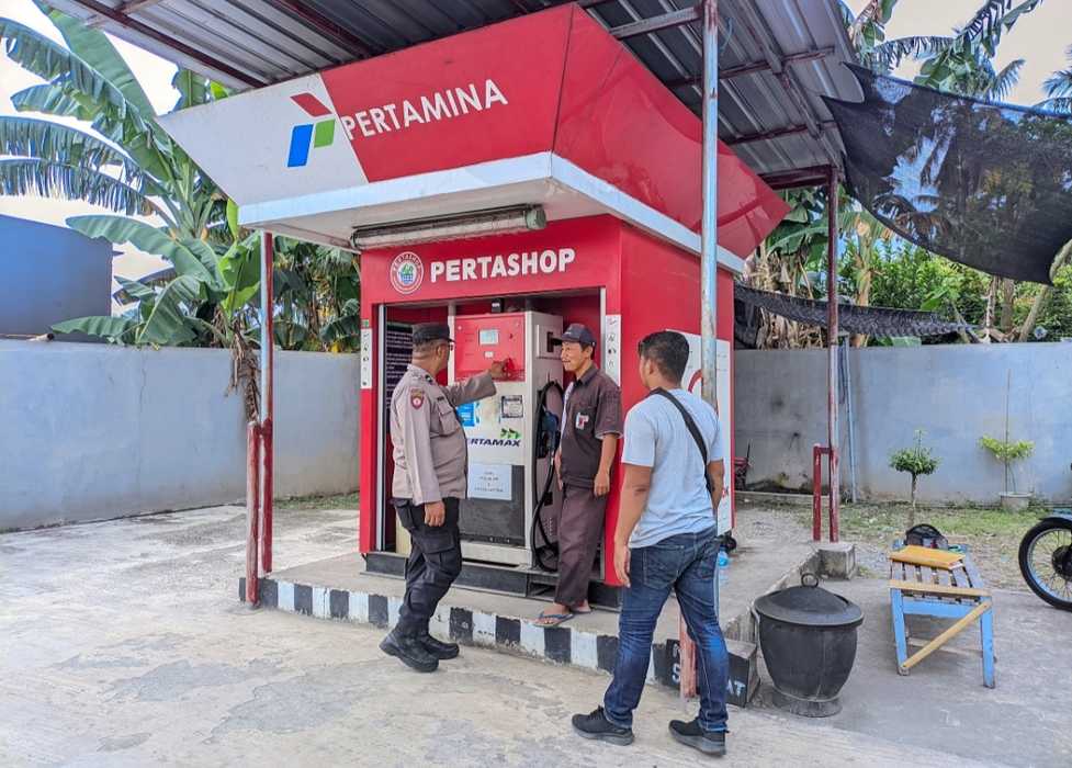 Anggota Polsek Nglegok melaksanakan patroli dialogis dengan karyawan pertashop di Desa Penataran dan warga yang mengisi BBM (02 Oktober 2025).