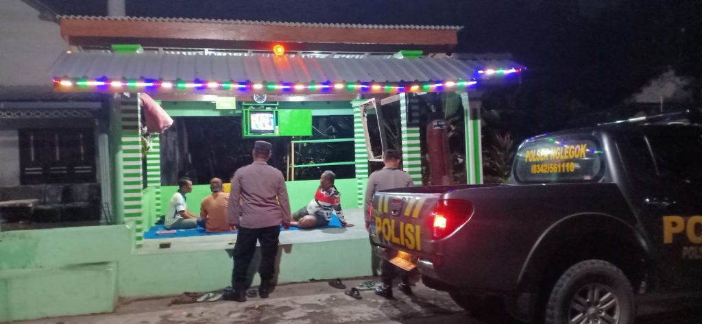 Anggota Polsek Nglegok yang melaksanakan patroli mobiling, berhenti di salah satu poskamling warga di lingkungan Kelurahan Nglegok. Beberapa warga terlihat sedang berada di poskamling dan sebagian melaksanakan ronda keliling lingkungan.
