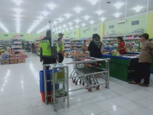 Personil melakukan patroli di Minimarket Srengat dan bertemu karyawan toko setempat sembari menyampaikan himbauan tentang kewaspadaan terhadap gangguan Kamtibmas.