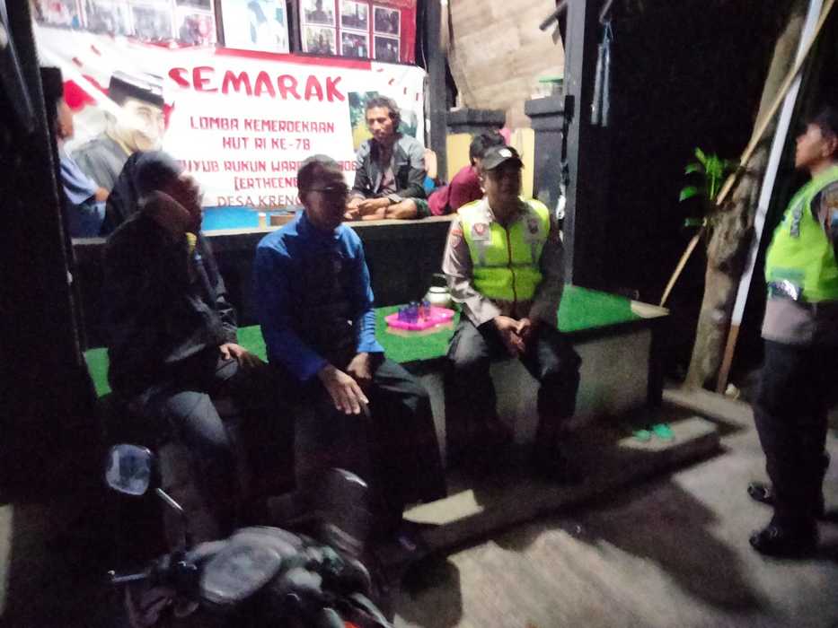 Anggota Polsek Nglegok yang melaksanakan patroli mobiling, berhenti di salah satu poskamling warga di lingkungan Desa Krenceng. Beberapa warga terlihat sedang berada di poskamling dan sebagian melaksanakan ronda keliling lingkungan.