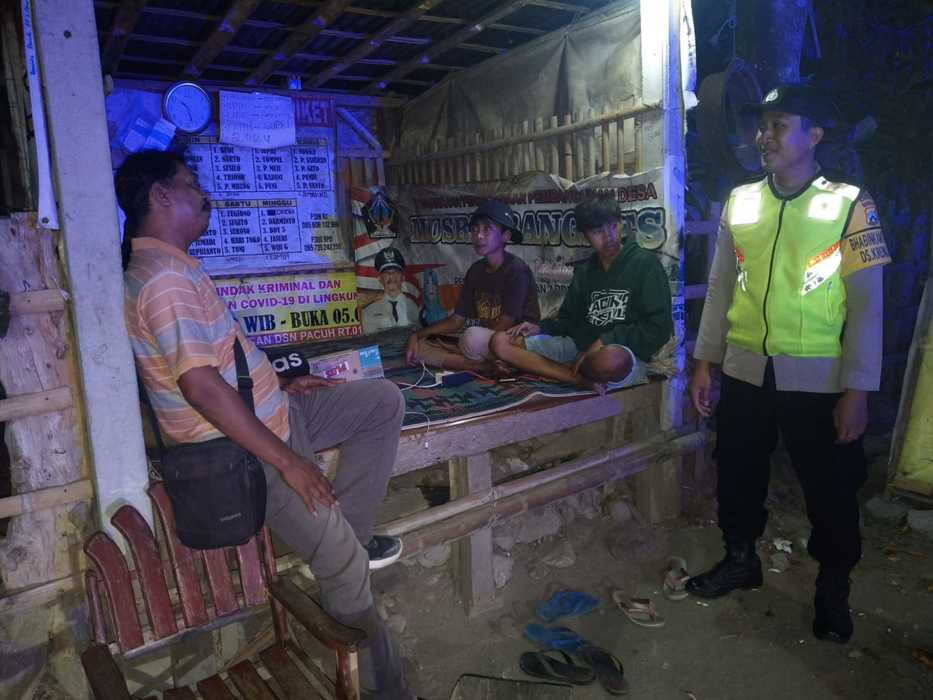 Anggota Polsek Nglegok yang melaksanakan patroli mobiling, berhenti di salah satu poskamling warga di lingkungan Desa Kemloko. Beberapa warga terlihat sedang berada di poskamling dan sebagian melaksanakan ronda keliling lingkungan.