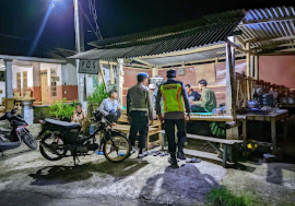 Anggota Polsek Nglegok yang melaksanakan patroli dan bertemu dengan warga yang melaksanakan siskamling di salah satu Poskamling di lingkungan Desa Jiwut.
