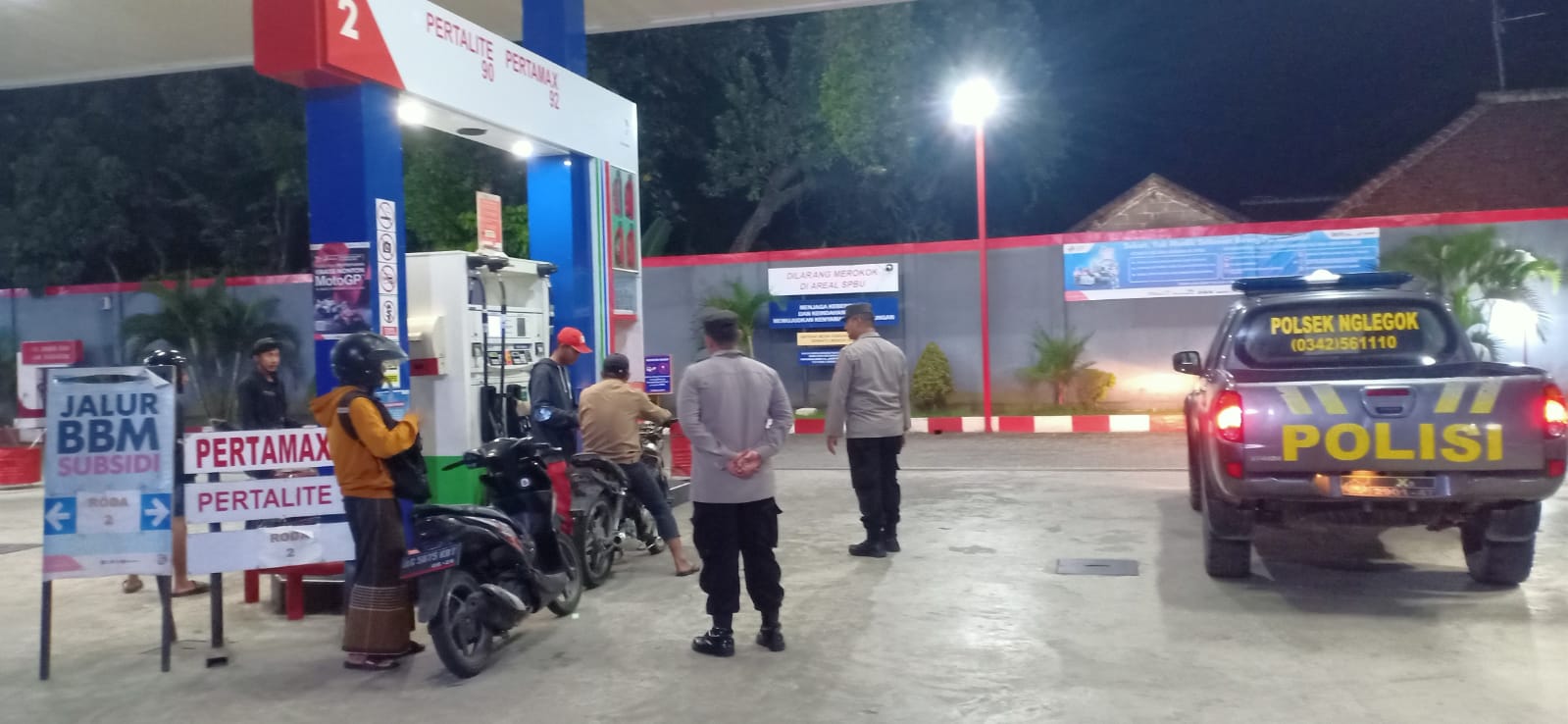 Salah satu yang dilaksanakan oleh anggota Polsek Nglegok dalam hal menanggulangi gangguan kamtibmas adalah melaksanakan patroli malam dan himbauan kamtibmas kepada warga. Terutama di obyek vital yang buka hingga larut malam. (06 Januari 2026)