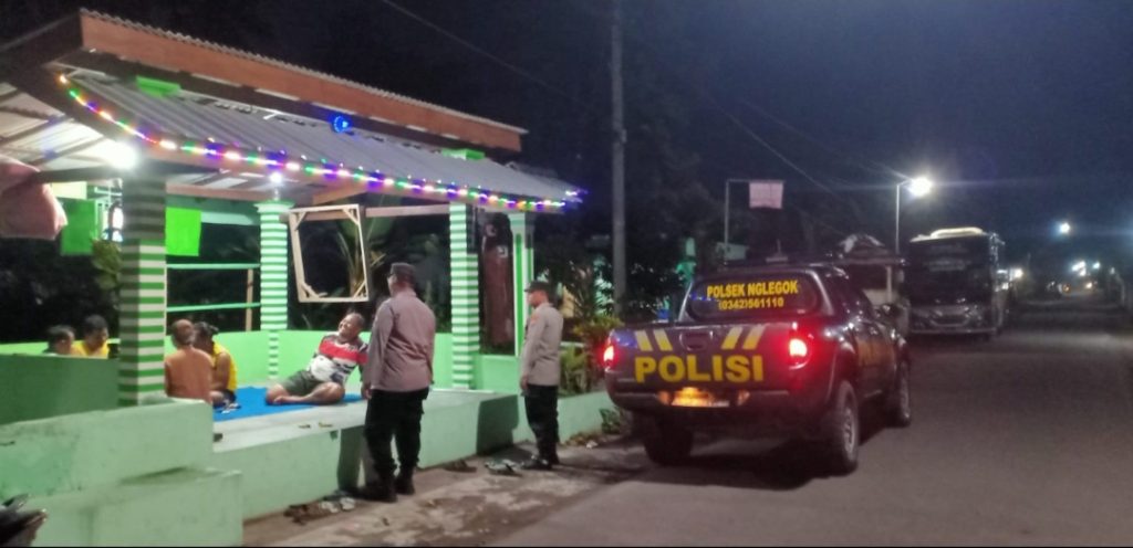 Anggota Polsek Nglegok yang melaksanakan patroli mobiling, berhenti di salah satu poskamling warga di lingkungan Desa Jiwut. Beberapa warga terlihat sedang berada di poskamling dan sebagian melaksanakan ronda keliling lingkungan.