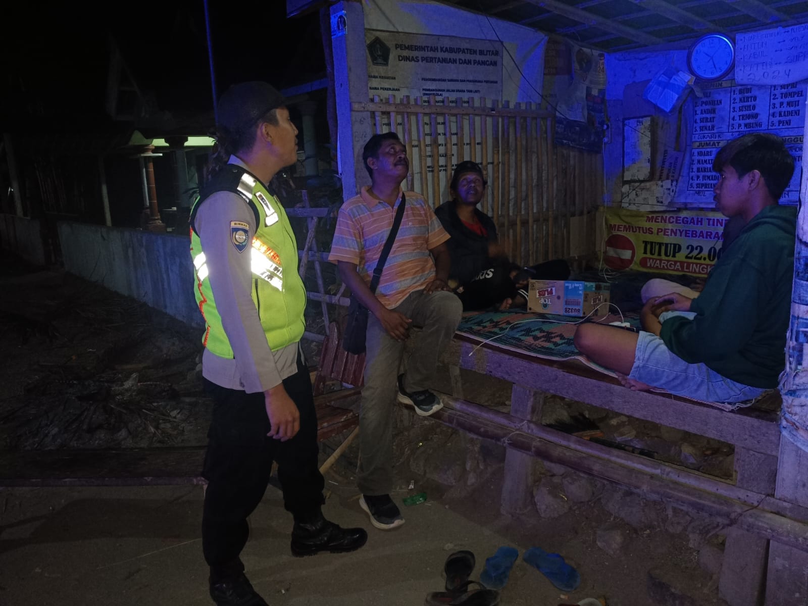 Anggota Polsek Nglegok yang melaksanakan patroli mobiling, berhenti di salah satu poskamling warga di lingkungan Desa Sumbersari. Beberapa warga terlihat sedang berada di poskamling dan sebagian melaksanakan ronda keliling lingkungan.