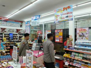 Personil melakukan patroli di minimarket dan bertemu karyawan toko setempat sembari menyampaikan himbauan tentang kewaspadaan terhadap gangguan Kamtibmas.